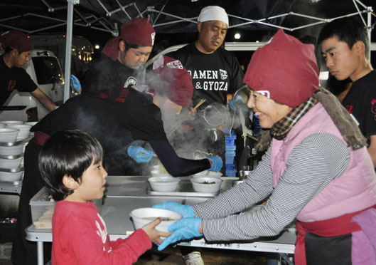 Hoặc tại thị trấn Mashiki, nơi đầu tiên phải hứng chịu trận động đất của tỉnh Kumamoto, một điểm phân phát mỳ Ramen miễn phí của công ty Shigemitsu Industry, đơn vị chủ quản thương hiệu nhà hàng Ajisen Ramen đã được lập ra. Chủ tịch công ty cho biết ông rất bất ngờ khi Kumamoto có ngày bị động đất, và ông "không thể ngồi im mà chẳng làm gì".