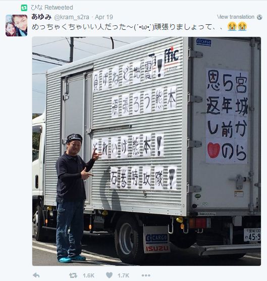 Mạng xã hội Twitter của Nhật trong nhiều ngày nay liên tục xuất hiện một bức hình chiếc xe tải có dán chữ trên khoang hàng, đứng bên cạnh là một người đàn ông đang tươi cười hớn hở. Tấm ảnh do người dùng có tên "mad098" đăng tải đầu tiên, sau đó được các thành viên Twitter Nhật Bản và cả thế giới thi nhau chia sẻ lại.