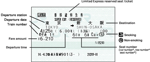 Hình ảnh ở trên minh họa cho loại vé đặt chỗ trước dành cho tàu nhanh đặc biệt, chặng từ Tokyo đến Shin-Osaka, khởi hành vào ngày 25/4 lúc 6h và đến nơi lúc 8h30, tàu số 1, toa số 6, hàng ghế C, ghế số 6, khoang không dành cho người hút thuốc, giá vé là 6.210 Yên.