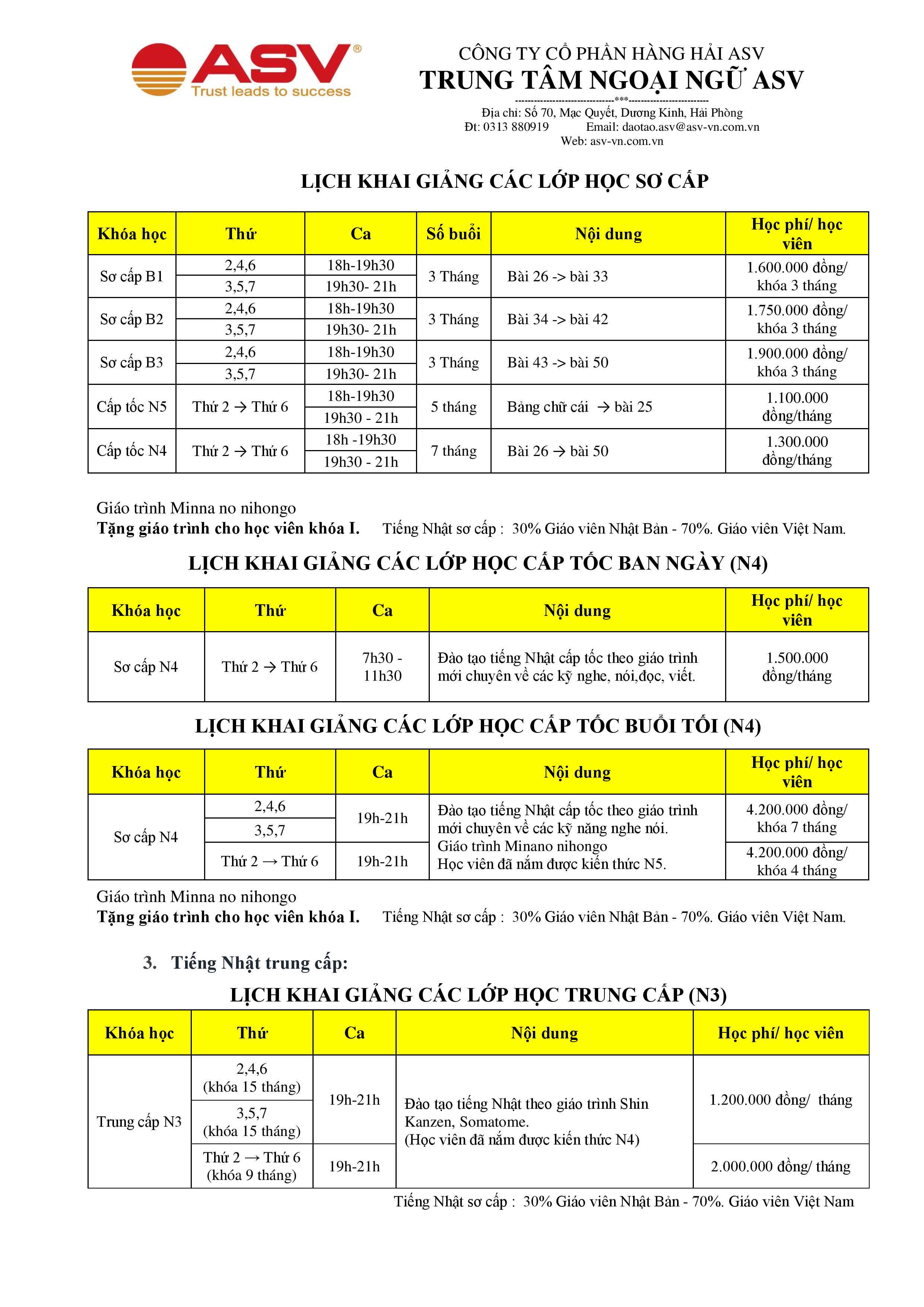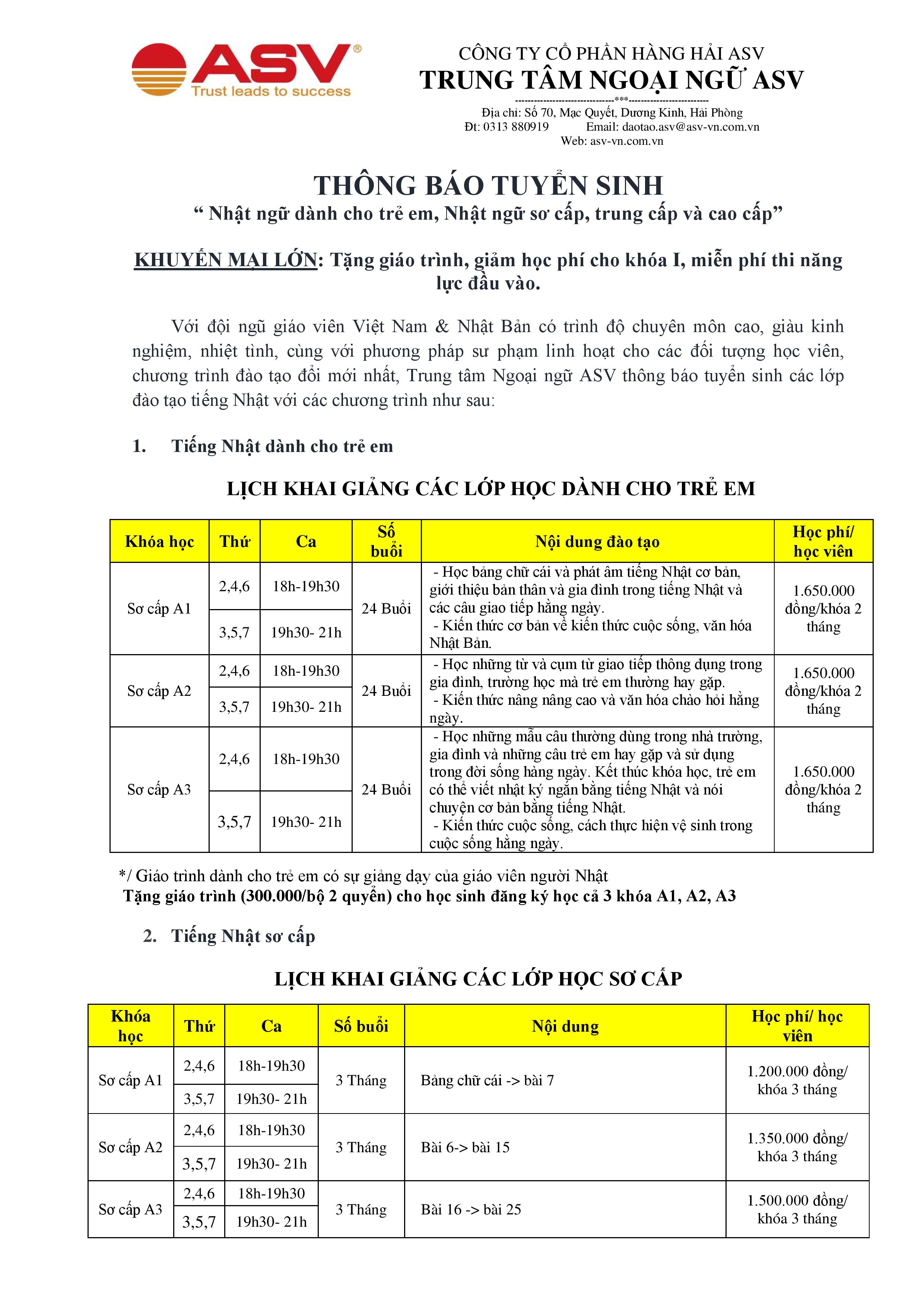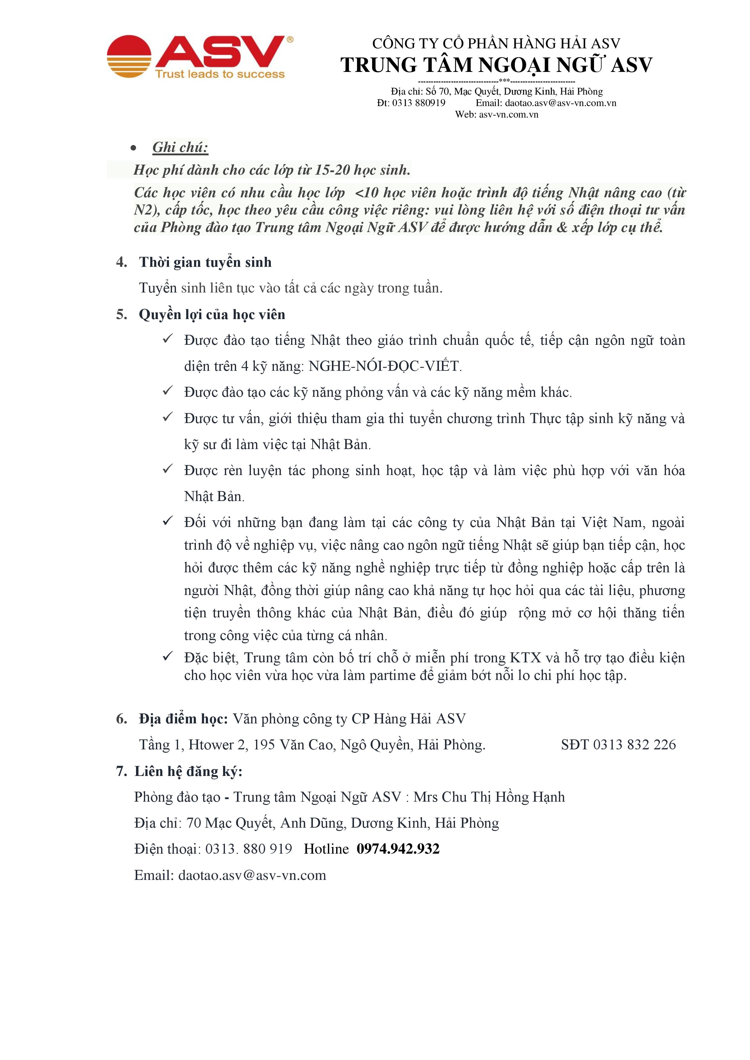 Với đội ngũ giáo viên Việt Nam & Nhật Bản có trình độ chuyên môn cao, giàu kinh nghiệm, nhiệt tình, cùng với phương pháp sư phạm linh hoạt cho các đối tượng học viên, chương trình đào tạo đổi mới nhất, Trung tâm Ngoại ngữ ASV thông báo tuyển sinh các lớp đào tạo tiếng Nhật với các chương trình: