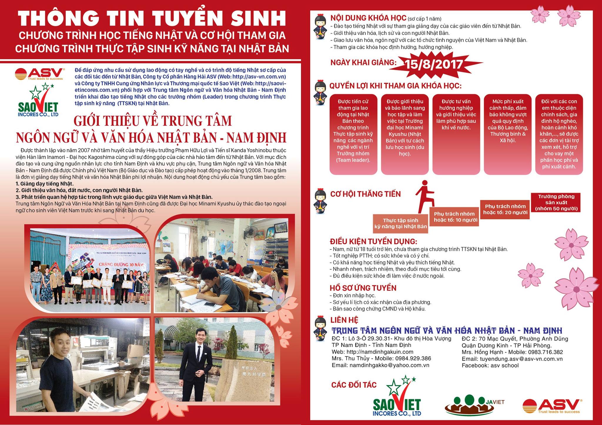ASV School kết hợp với Trung tâm Ngôn ngữ và Văn hóa Nhật Bản tại Nam Định tiếp tục tuyển sinh lớp Sơ cấp tiếng Nhật ( khóa 4) khai giảng ngày 15/08/2017. Tham gia khóa học các bạn sẽ được chính các thầy cô người Nhật tâm huyết truyền thụ kiến thức, được thường xuyên gặp gỡ và trao đổi với các Giám đốc doanh nghiệp Nhật Bản khao khát nguồn lao động trẻ có tay nghề và có năng lực tiếng Nhật.