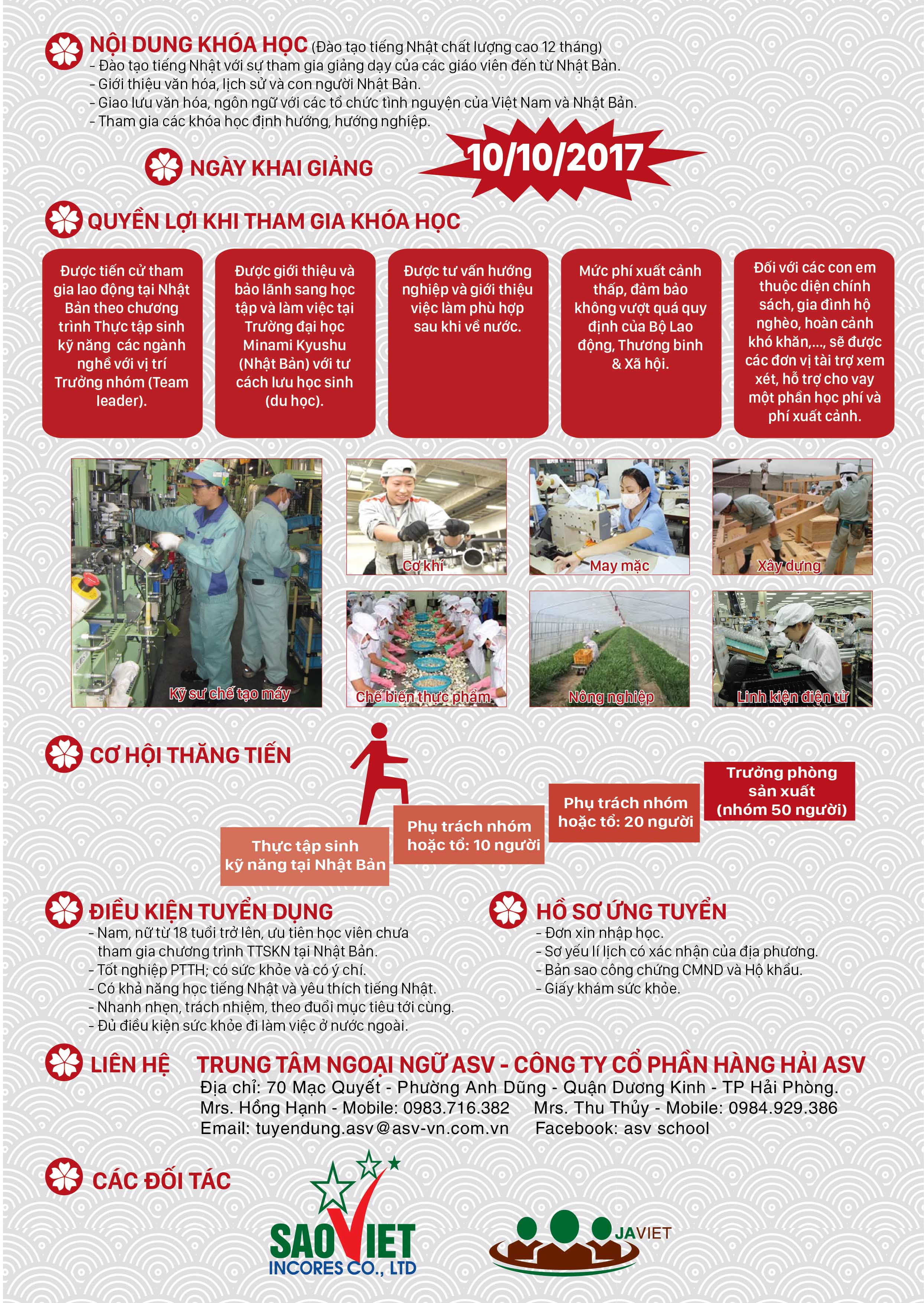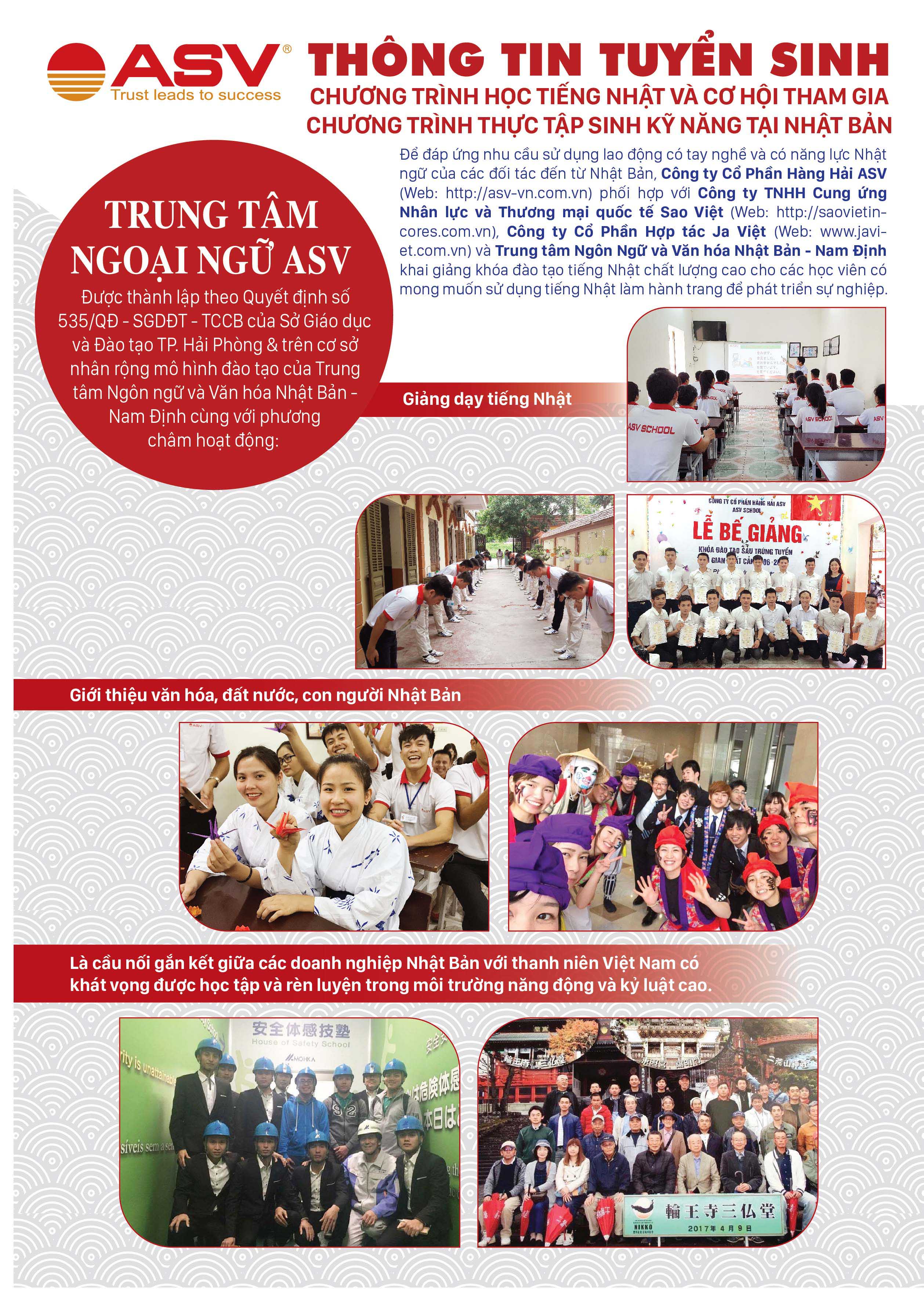 Sau thành công của 4 khóa học tiếng Nhật tại Trung tâm Ngôn ngữ và Văn hóa Nhật Bản tại Nam Định, lần đầu tiên ASV School tuyển sinh lớp tiếng Nhật chất lượng cao – Khóa 01 tại Hải Phòng.