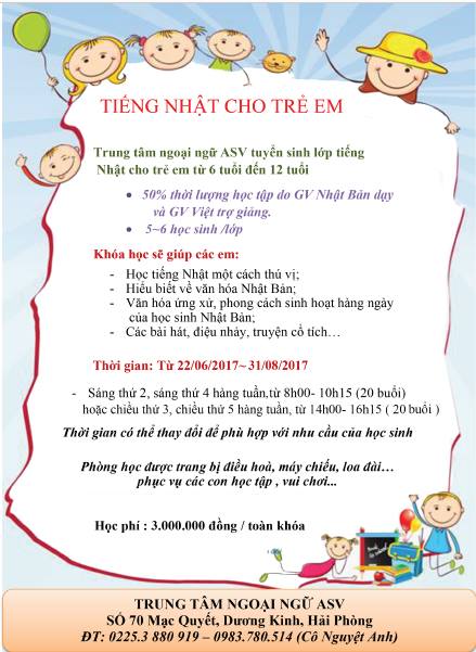 Trung tâm ngoại ngữ ASV (ASV School) là đơn vị tiên phong giảng dạy tiếng Nhật cho học sinh tiểu học ở 02 trường trọng điểm của thành phố: trường tiểu học Đinh Tiên Hoàng và trường tiểu học Nguyễn Thị Minh Khai. Để đáp ứng nhu cầu học tiếng Nhật một cách hiệu quả nhất đối với trẻ tiểu học, ASV School trân trọng gửi tới Quý Phụ huynh và các em học sinh chương trình “ Vui hè cùng tiếng Nhật" từ ngày 22/06/2017.